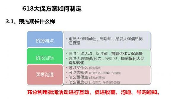 预热期具有哪些特点呢?距离大促时间近,周期短,品牌大促信息记忆度强;以及这个时期商家们的阶段目标和买家进行互动的时候需要从哪些维度出发,都具备它的特性。作为商家,这个时候我们需要通过互动活动,促收藏,提前优化大促流量,通过优惠券提醒或预告,发红包,提前优化大促购买转化。同时我们要研究买家心理,这个时候买家一般在思考可以买什么、可以去哪买、怎么更便宜、怎么更放心等。那么我们就要围绕买家想的,具体落实页面设计和活动布局,例如做导购清单、店铺签到、产品收藏、红包优惠券、大促物流告知等。对于这些细则点,有很多是能够在无线端实现的。尤其是通过微淘去实现。我们可以他充分利用微淘活动去进行互动、促进收藏、和消费者进行沟通,还有放上我们的导购通知等等。