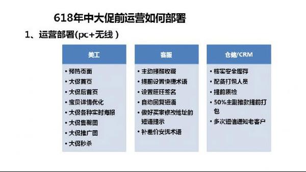 结合前面的各个时期的营销玩法,落实到各个岗位分工,包括的维度有:具体时间节点、具体的人员需要执行的具体内容。例如美工要做预热页面、大促首页、大促后首页、宝贝详情页优化、大促各种试试海报、大促售罄图、大促推广图、大促秒杀等; 客服方面就要做好主动提醒收藏、提前设置快捷术语、设置旺旺签名、自动回复短语、补差价安抚术语等等; 仓储方面需要核实安全库存、配备打包人员、提前质检、50%的主副推款提前打包、多次短信通知老客户等;