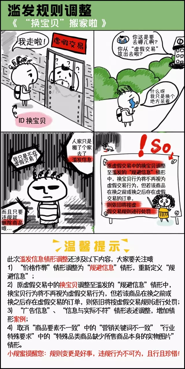 为了给予广大会员更加健康公平的经营环境,给予消费者更加安全明晰的购物体验,淘宝网针对“滥发信息”的规则,进行了一次较大规模的变动,此次规则变动主要在违规处理上进行了一些调整; 同时增加了换宝贝的违规类型;并对部分滥发违规情形进行了调整。