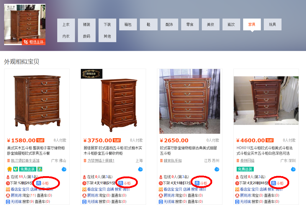 首先自己下载一个免费的店侦探插件,搜自己的宝贝主图,可以看到用的都是斗柜这个类目。我们可以参考用来先当自己的核心词。