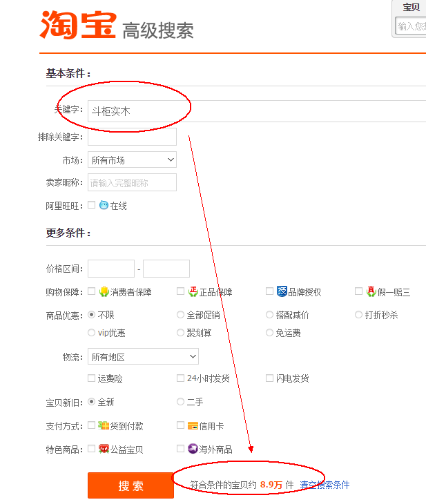 第二步在淘宝首页打开商品分类,里面有高级搜索,打开高级搜索,输入斗柜实木。
