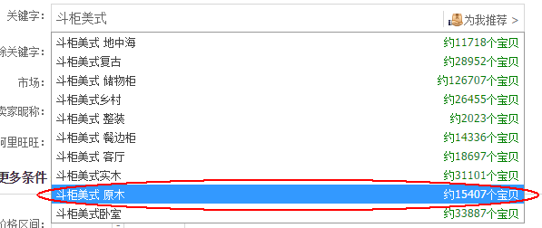 斗柜美式搜索出来销量高的宝贝跟我的宝贝风格非常类似。所以我们再用这个二级词去延伸搜索。再次输入,得到了几个三级词。我们可以发现斗柜美式竞争最小,但是我们之前用过这个属性词了,排除。还有地中海竞争第二小但是我搜索出来发现都是涂鸦花色的所以排除了。再就是餐边柜数据第三,但是也不符合,排除。第四数据的原木符合,那么我们确定斗柜美式原木。
